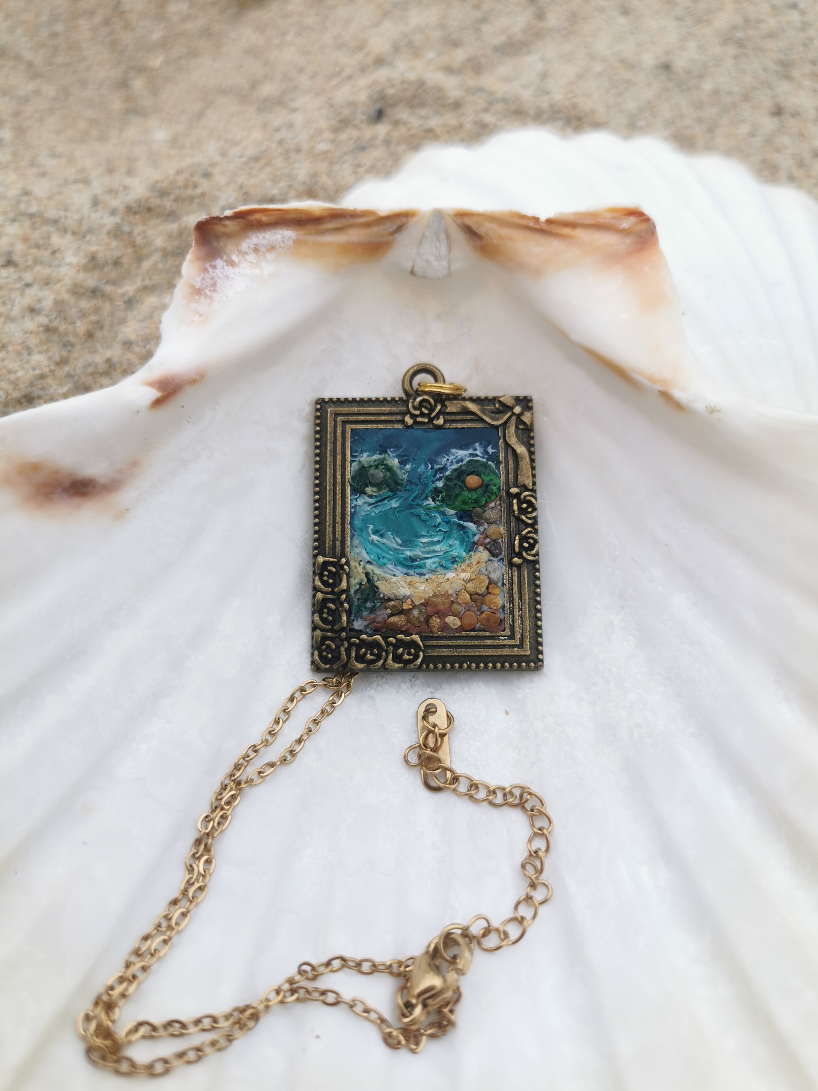 Colgante rectangular de acero color oro oscuro, con forma de marco con flores. Dentro de este marco, una representación de la bahia de la Concha de Donostia-San Sebastián pintada con arcilla polimerica, y que incluye arena de la misma Concha y piedrecitas. El collar es de acero inoxidable color oro.