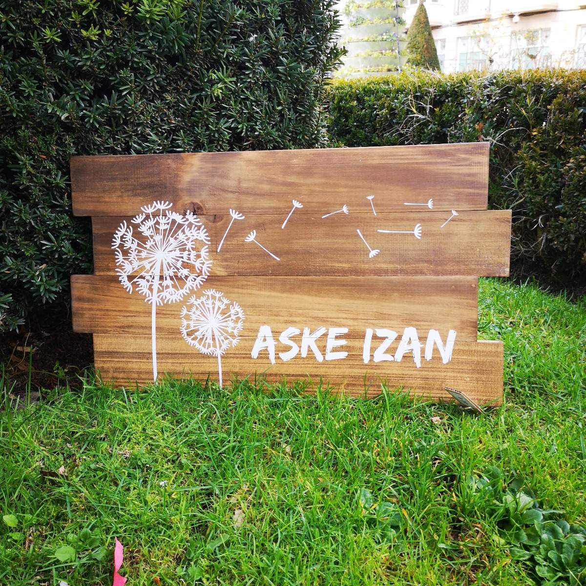 Fabricado con madera recuperada y mensaje ASKE IZAN rotulado.