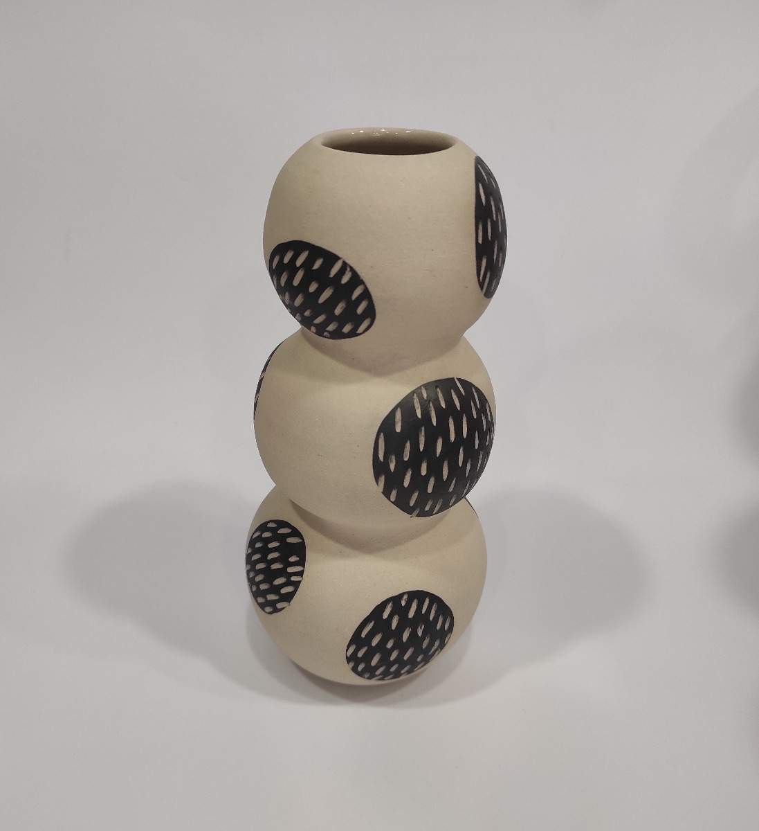 Jarrón de ceramica realizado en gres blanco y decorado con engobes. Coleccion LLUVIA Medidas aproximadas: 18 cm Las piezas estan torneadas, modeladas y decoradas a mano, por lo que pueden tener pequeñas imperfecciones o diferencias con las que se muestran en las fotografías.