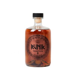 ¡Embárcate en un viaje de sabor único con el Runik Ron 8 años Tradition, un ron excepcionalmente vasco que celebra la rica tradición de la región! Destilado con esmero en el corazón del País Vasco, esta joya de 8 años de envejecimiento encarna la pasión y la destreza de los maestros roneros de la zona. Cada sorbo de este exquisito ron revela la influencia única de la tierra vasca, fusionando notas de caramelo, vainilla y roble con la frescura y vitalidad del entorno local. Este ron premium no solo ofrece un sabor excepcional, sino que también rinde homenaje a la rica herencia cultural y gastronómica de la región. Además, el Runik Ron 8 años Tradition ha sido galardonado con la medalla de Plata en el International Spirits Competition (Londres 2022), destacando su calidad excepcional y su excelencia reconocida a nivel internacional. Disfruta de la autenticidad y el carácter distintivo del País Vasco en cada botella de Runik Ron 8 años Tradition. Ya sea que lo disfrutes solo, en compañía de amigos o como parte de una experiencia gastronómica, este ron excepcional añadirá un toque vasco único a cualquier ocasión especial. El Ron del País Vasco. Elaborado a partir de una selección de aguardientes de caña del Caribe, madurados en barricas de roble americano, previamente aromatizadas de forma natural con frutas, raíces y especias, siguiendo técnicas tradicionales y artesanales de nuestra casa que le confieren este "ron especiado" unas características organolépticas muy particulares.   Nota de  Cata: De color miel de brezo con reflejos cobrizos. Aroma fresco a caña de azúcar, vainilla, piel de naranja, coco y una gran variedad de especias. De paso suave y sedoso en boca, sabroso y bien estructurado con un final elegante y afrutado. Para beber ólo o mezclado en coctelería.