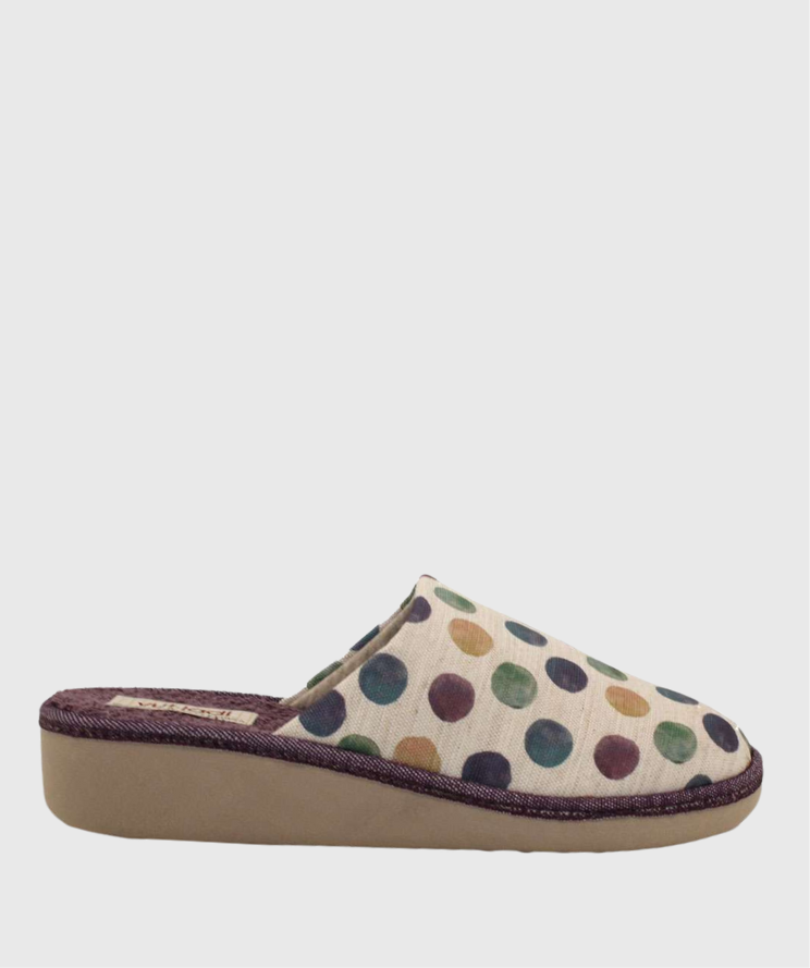 8641 ZAPATILLA DE CASA VUL-LADIExterior: topos textilInterior: Rizo / algodon naturalPiso: poroso perla (planta acolchada) 3.5cmFabricado: España