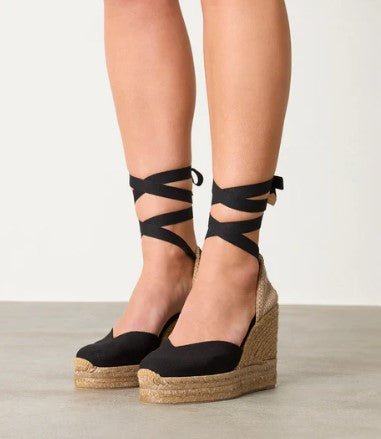 Color Negro Composición Interior: 100% cuero vacuno. Exterior: 100% algodón. Suela: caucho. Medidas del producto Altura total: 11cm Plataforma/Altura: 3cm Altura Cuña/Tacón: 8cm
