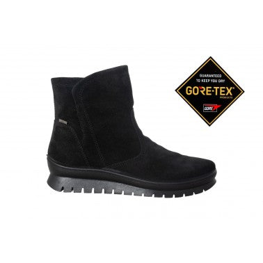 Botín impermeable para mujer. Exterior de piel-serraje. Forrado con una membrana de Goretex que protege al pie de la lluvia, mantaniéndolo siempre seco. Cierre de cremallera y cuña de 2,5 cm. Suela ligera y flexible. Un imprescindible para el invierno, fabricado con la garantía de calidad made in Italy.