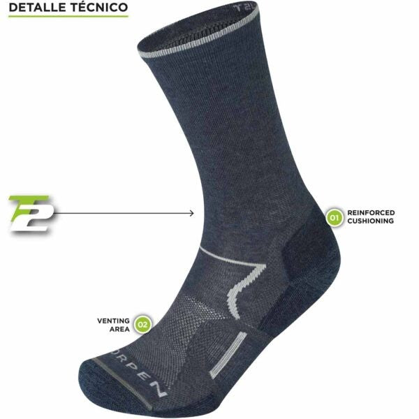 Toda la superficie del calcetín está acolchada. Una buena ventilación asegura que el pie no se sobrecaliente. Los calcetines se ajustan con precisión, sin arrugas. INFORMACIÓN Altura: Crew (Altura tradicional. Llega hasta la mitad de la espinilla) Refuerzo: Suela Acolchado: Suela Temporadas: Otoño Primavera Verano Invierno Grosor: Medio (2/4) CARACTERÍSTICAS Tecnología técnica de dos capas de hilo diferenciadas, que mezcla diferentes tipos de fibras ofreciendo un rendimiento limitado para el pie del deportista. La lana de oveja Merino, por la mayor longitud y menor diámetro de sus fibras, da como resultado un hilo más suave y de rizo más fino que es más agradable en contacto con la piel que la lana de otras razas de ovejas. El núcleo de la fibra es hidrófilo y transpirable. Al ser una fibra que retiene el calor incluso húmedo, es la fibra intermedia en los calcetines T3 y la fibra principal de los calcetines T2 para uso en temperaturas más frías. Hilo poliéster desarrollado por PrimaLoft® (nº1 mundial en aislante térmico artificial en prendas técnicas). Resulta una fibra suave, térmicamente aislante, hidrófoba que expulsa y no absorbe humedad hecho ahora con un 70% del contenido proveniente de recursos reciclados, como botellas de plástico. El hilo Red-Cycled Nylon está hecho 100% con redes de pesca cuya vida útil en la industria pesquera ha llegado a su fin. De este modo, en lugar de convertirse en un peligro en el fondo del mar, se reciclan para da vida a un nuevo hilo de nylon. Este hilo de fibra continua se caracteriza por su resistencia y capacidad de amortiguación. Es la fibra del mercado que mejor aguanta el desgaste. La Lycra es una fibra de elastano sintético que puede estirarse hasta seis veces su longitud y volver a su estado original una y otra vez. Su colocación estratégica en la capa exterior del calcetín Lorpen garantiza su larga vida. Junto con el Nylon, la Lycra se caracteriza por su resistencia y capacidad de amortiguación. COMPOSICIÓN TÉCNICA 66%MerinoDry ECO 22%Stretch Nylon with Lycra 12%Red-Cycled nylon GUÍA DE TALLAS TALLA M: 39-42 TALLA L:  43-46 TALLA XL: 47-50