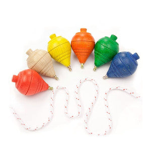 Clásico juego de habilidad que consiste en hacer bailar la peonza lanzándola con la cuerda. - Material: haya - Colores surtidos - Punta redonda - 40mm Ø