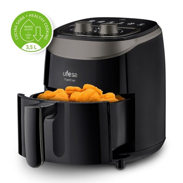 Freidora de aire 3.5L Panther Prepara más rápido tus platos favoritos con la freidora de aire Panther y su tecnología 360º de circulación de aire a alta velocidad. Con su capacidad de 3,5L es ideal para familias de 3 personas. Además, es muy intuitiva y fácil de utilizar. Cuenta con control de temperatura hasta 200ºC y cuerpo y asa de tacto frío. Su limpieza será muy sencilla gracias a su cubeta y bandeja anti-adherentes.