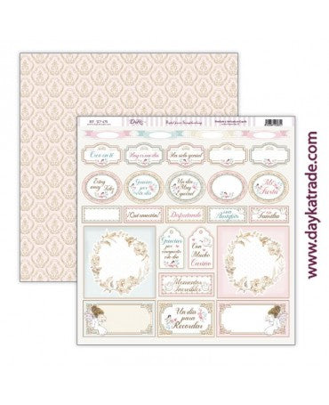 PAPEL SCRAP Dayka "HOY ES MI DÍA" COMUNIÓN Papel para Scrapbooking Dayka etiquetas con textos, angelitas y fondo rosa y beige. Papel a doble cara Dayka, diseñado y producido en España. Papel 224 gr.