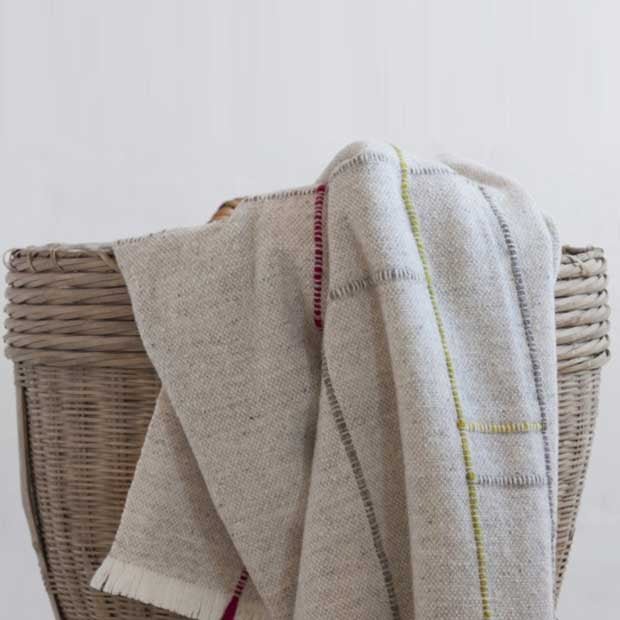 100% materiales ecológicos Tejido en lana merino de la Provenza francesa. Bordes en colores vivos y de tinte vegetal. Tejido a mano en Barcelona Producción sostenible