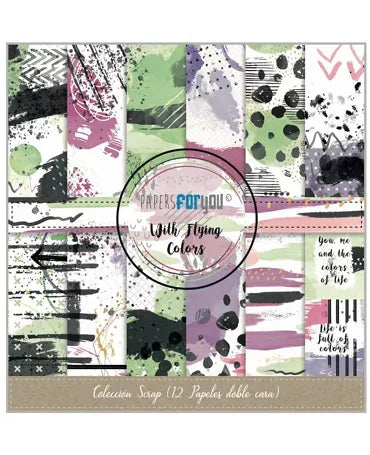 Kit de 12 papeles de doble cara de la colección WITH FLYING COLORS de Papers for You. Contiene 12 papeles de doble cara de 190 gr. Papeles con delicadas ilustraciones. Tamaño: 30.5 x 30.5 cm. Libres de ácido y ligninas.