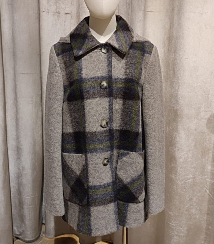 Abrigo corto estampado a cuadros. Cierre con botones, bolsillos delanteros, cuello y capucha. Un modelo juvenil y ligero para todos los días. Composición:  60% Lana, 40% Poliester. Forro 100% Poliester.