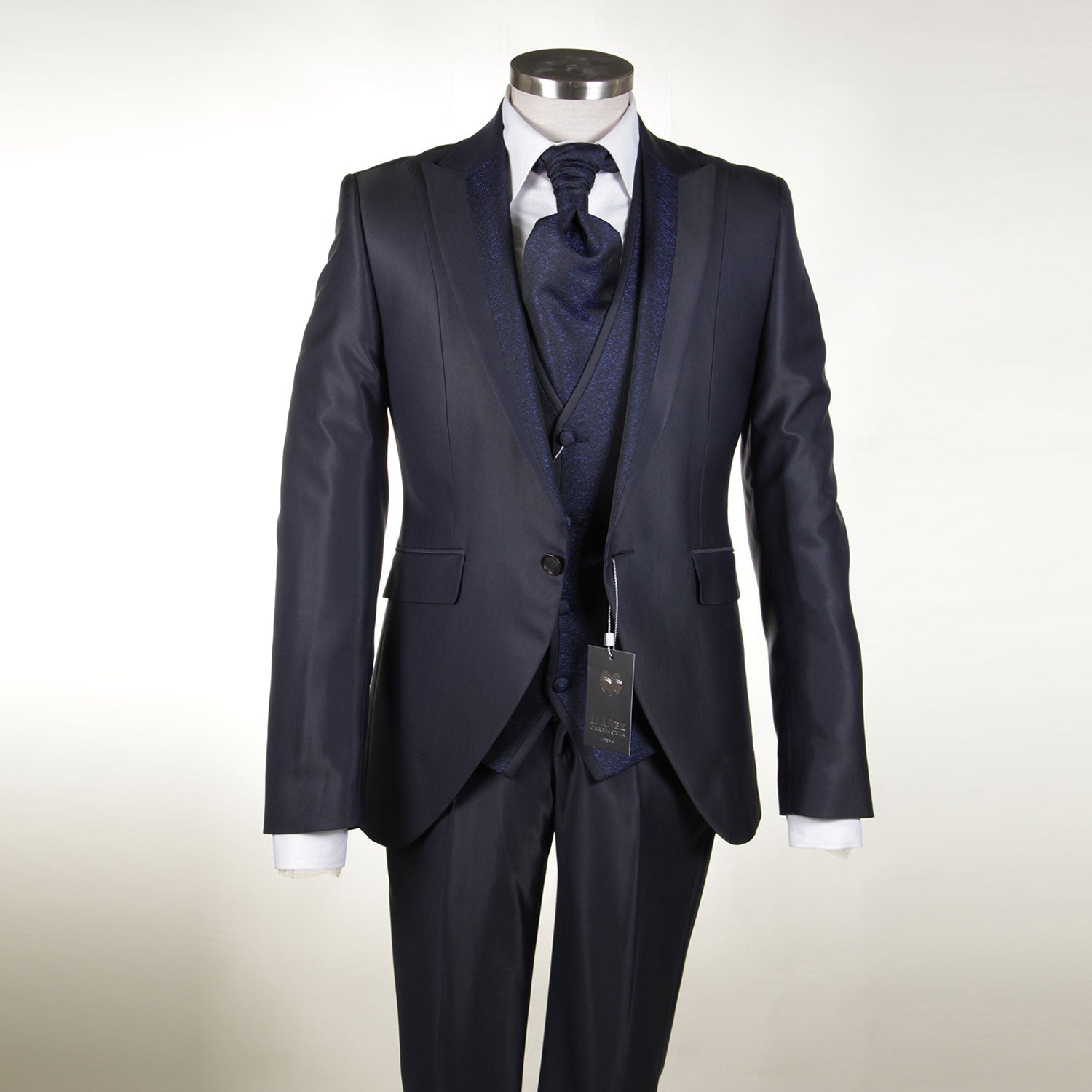 Traje con chaleco, solapa contraste, color azul, slim fit.
