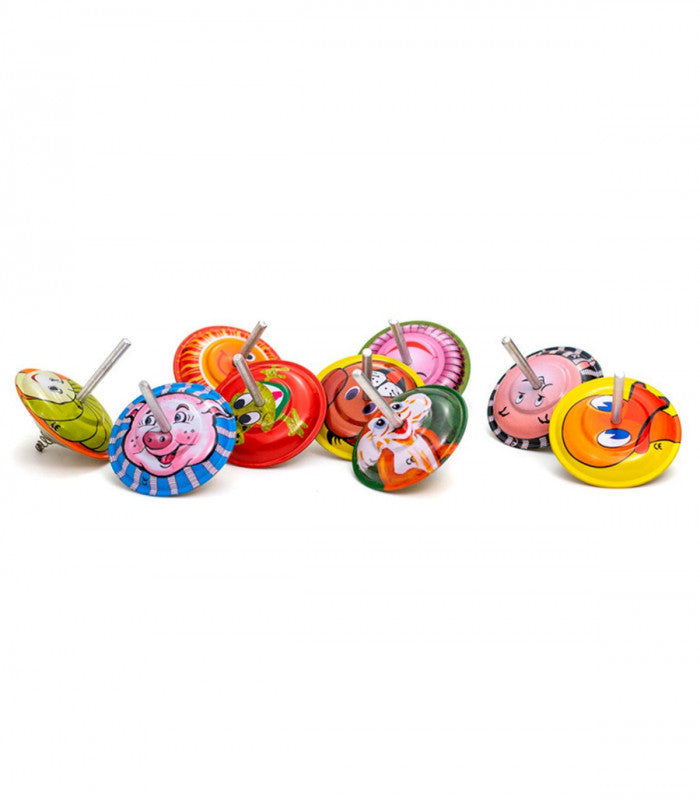 Peonza vintage de hojalata. Los juguetes de hojalata representan una época pasada cuando los niños tenían muchos menos juguetes para jugar. A causa de los bordes afilados, las piezas pequeñas, llaves sueltas y mecanismos de relojería, la mayoría de los juguetes de hojalata no son adecuados para los niños; son artículos de decoración y colección para mayores de 14 años.