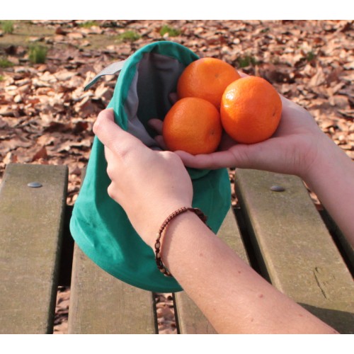 La bolsita porta snacks "manos libres". Es reutilizable, plegable y, gracias a su diseño, puede sostenerse abierta sobre cualquier superficie. Así podrás ir cogiendo tus frutos secos, galletas o cualquier otro snack sin tener que sujetar la bolsa