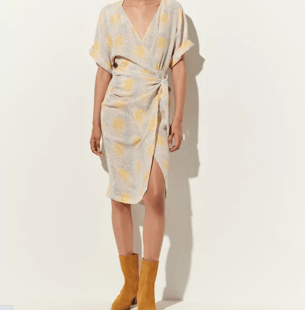 Cuello en V. Manga corta con vuelta. Detalles de fruncidos en la parte delantera y trasera. Bajo envolvente anudado. Composición: 100 % cupro SESSUN