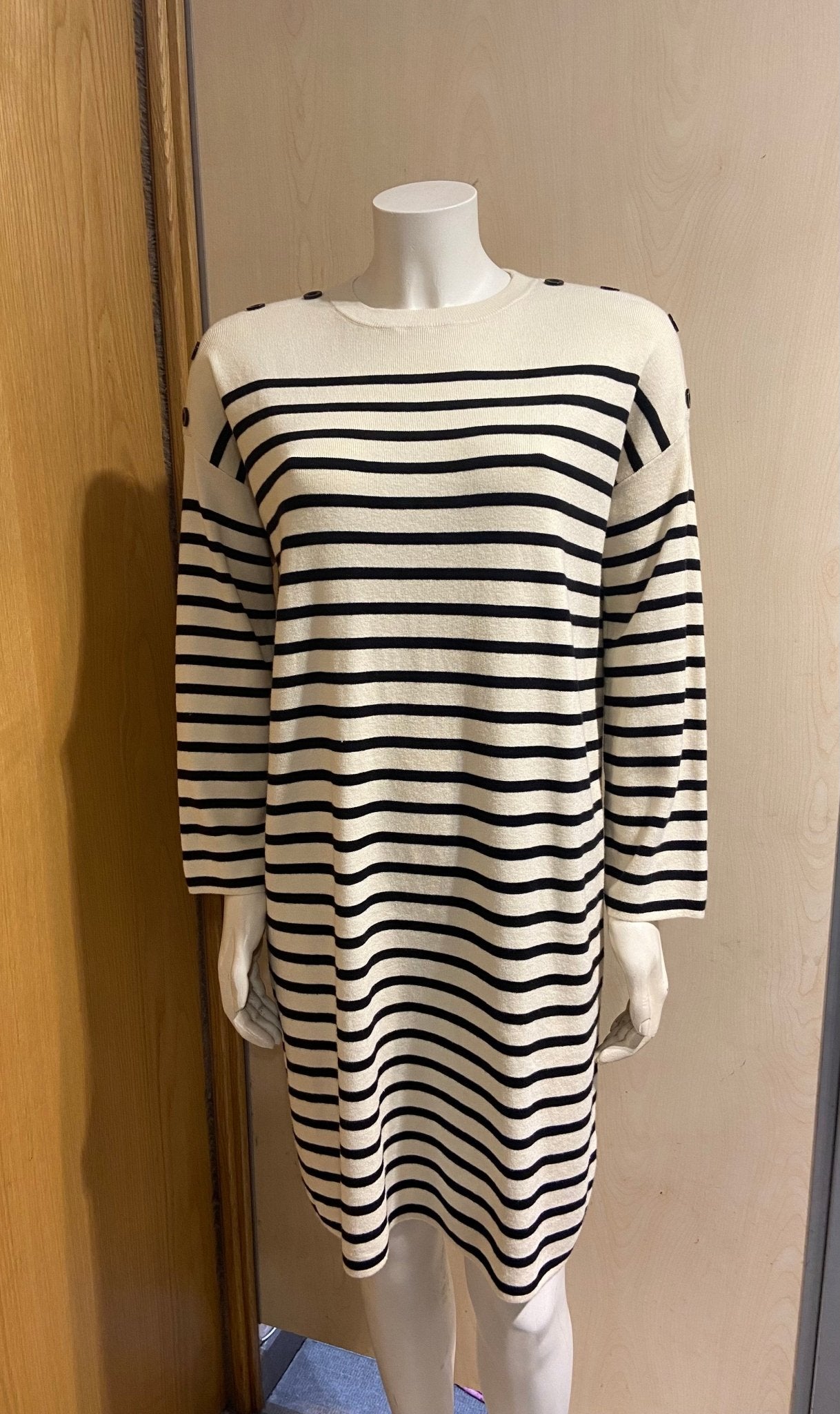 Vestido de rayas en color blanco con detalles de botones en los hombros.