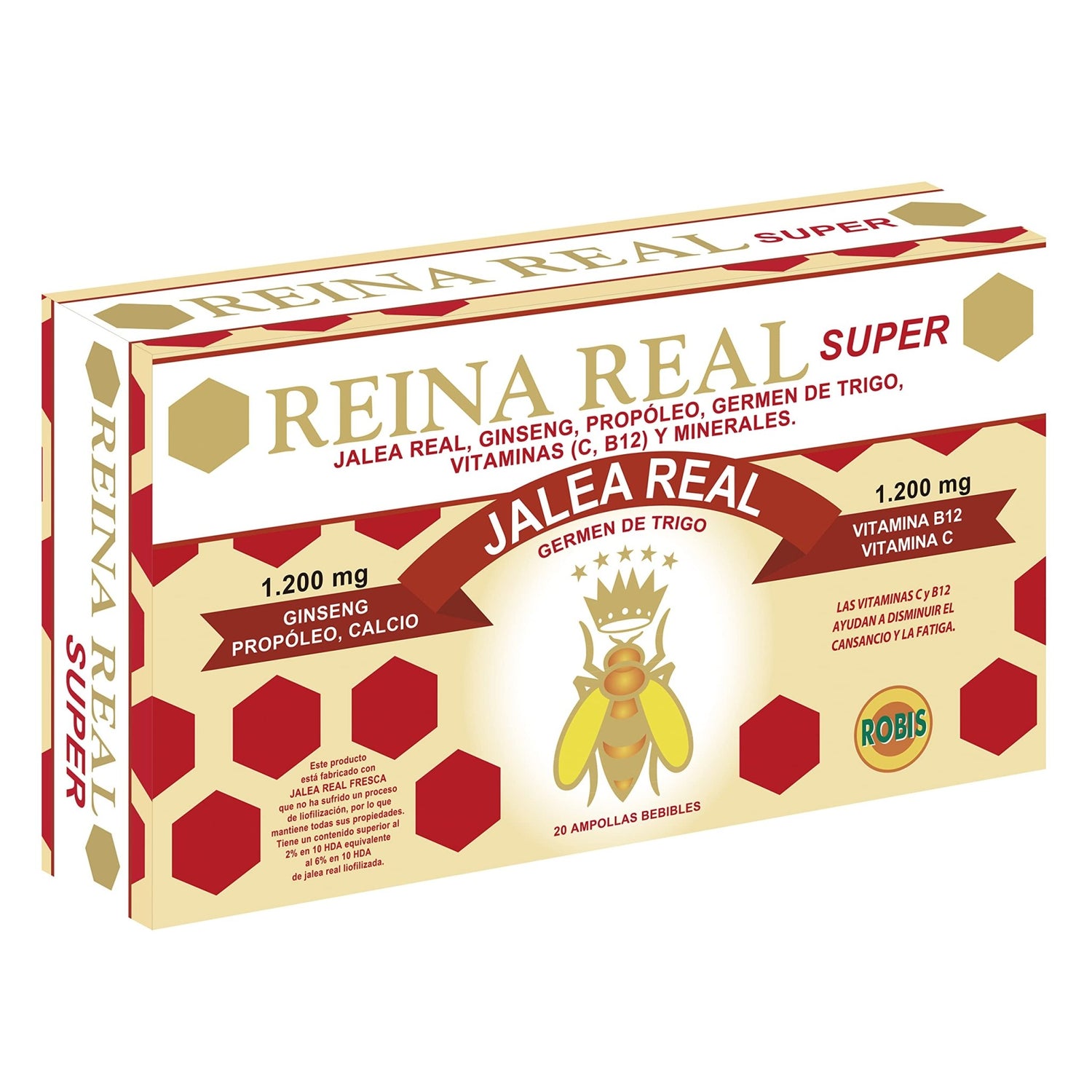 Reina Real Super de Robis está fabricada con Jalea Real Fresca que no ha sufrido un proceso de liofilización, por lo que mantiene todas sus propiedades. Tiene un contenido superior al 2% en 10 HDA que equivale al 6% 10 HDA de jalea real liofilizada. Observaciones:Ampollas envasadas herméticamente, protegidas de la luz y de los agentes contaminantes, garantizando un producto con todos sus ingredientes, de la máxima calidad y efectividad.Modo de empleo:Se recomienda tomar 1 ampolla al día, por la mañana y en ayunas. Puede tomarse directamente o diluida en un poco de agua o zumo.Agitar antes de usar.Presentación: 20 ampollas bebibles de 10 ml.