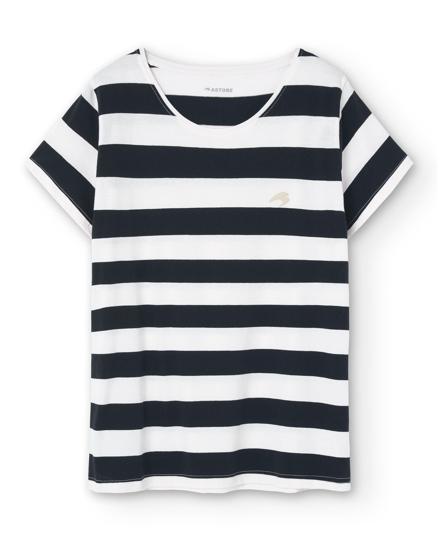 Camiseta de rayas en manga corta de mujer fabricada en algodón orgánico y tintada en prenda.