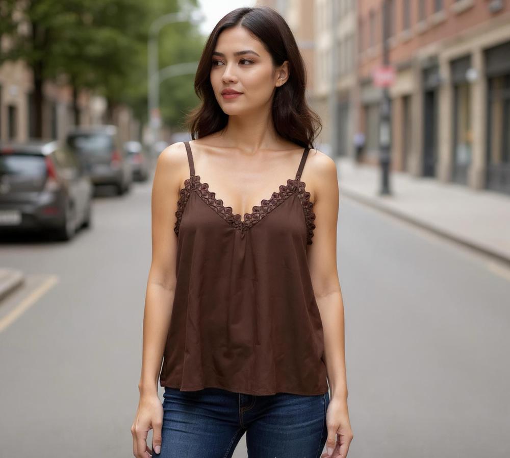 Top lencero con escote en pico y detalle de encaje calado a lo largo del borde. Presenta tirantes finos y tejido fluido, ideal para looks elegantes o combinaciones informales con un toque delicado. Su diseño ligero lo convierte en una prenda versátil para cualquier temporada.