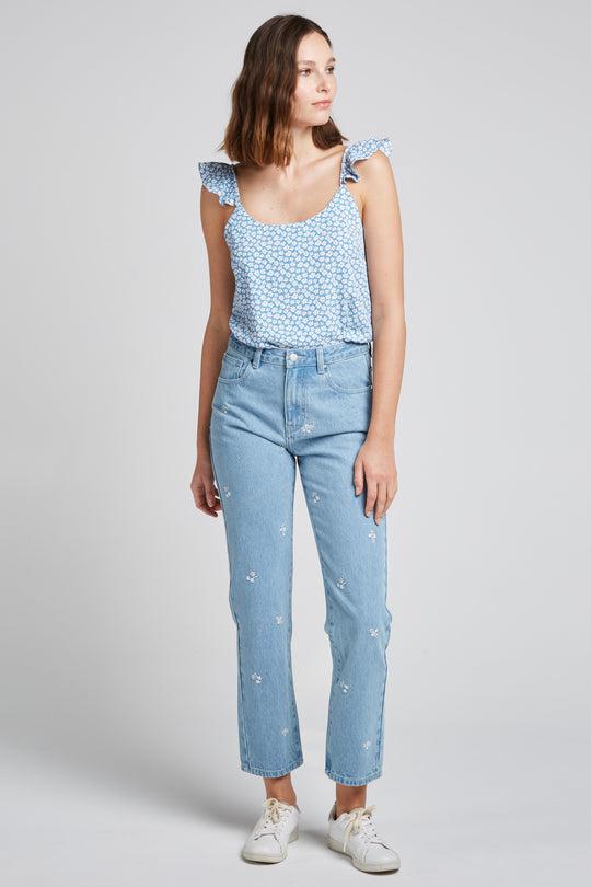 La camiseta de tirantes DAN, con sus tirantes finos y sus delicados volantes, es una prenda femenina y ligera que es ideal para los días soleados. Confeccionada en 100% poliéster, ofrece una gran ligereza y un confort óptimo. Su estampado floral azul aporta un toque de frescura y alegría a tu outfit. Esta camiseta sin mangas combina perfectamente con jeans o una falda para un look veraniego y casual.