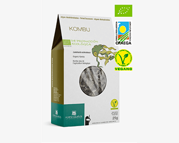 Alga Kombu (Laminaria ochroleuca) de produccion ecologica. ES- ECO-022-GA AGRICULTURA UE. Algas recolectadas a mano en su medio natural en la costa de Galicia (Golfo de Vizcaya y Aguas portuguesas). Sabor iodado y ligeramente ahumado. 25g USOS EN LA COCINA Es una de las algas que mas se consume en el mundo. Tradicionalmente se usa para aromatizar el agua que se utiliza como base en la elaboracion de platos como sopas, fondos de arroz, coccion de legumbres, guisos de carne y pescado, coccion de mariscos, elaboracion de salsas, etc. Se recomienda utilizar 1-2 g de alga kombu deshidratada por cada litro de agua para la preparacion del caldo..