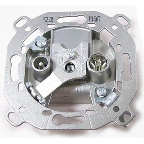 Toma antena TV/SAT separadora final televes 5226 Caracteristicas: Valido para Niessen, Simon, schneider electric, jung, bjc, legrand, efapel. Sin duda, una de las mejores tomas de antena del mercado. Vivo de engaste rapido y seguro Sujeccion del vivo al cable con la fuerza equivalente a la de un tornillo. Guia tipo conector F para introducir el vivo. Margen amplio en la longitud del vivo (5...15mm) que dificulta los cortos entre vivo y malla. Brida en parte superior con apertura de 150º La brida consta de 3 filas dentadas en 9 mm para una perfecta sujeccion de la malla. Televes