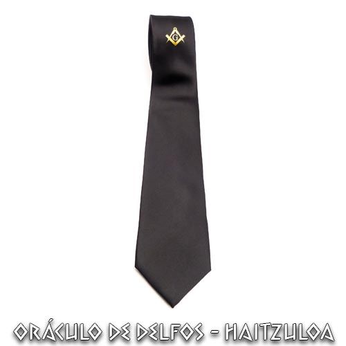 Tradicional corbata negra con escuadra y compas color dorado. Apta para cualquier ceremonia masonica con la simbologia tradicional claramente destacada.
