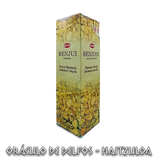 El incieso de Benjui, se elabora con una resina balsamica, nativa de las zonas tropicales del Oriente lejano. En la India, el benjui se quema en el templo frente a las estatuas de Brahma, Vishnu y Shiva. Se dice que el benjui estimula la imaginacion y la inspiracion, y puede ser eficaz cuando estas involucrado en el trabajo creativo.La gama de varitas de incienso, de la corporacion HEM de Mumbai y Bangalore, son hechos a mano en la India a partir de ingredientes de primera calidad, ninguno de los cuales se prueban en animales.