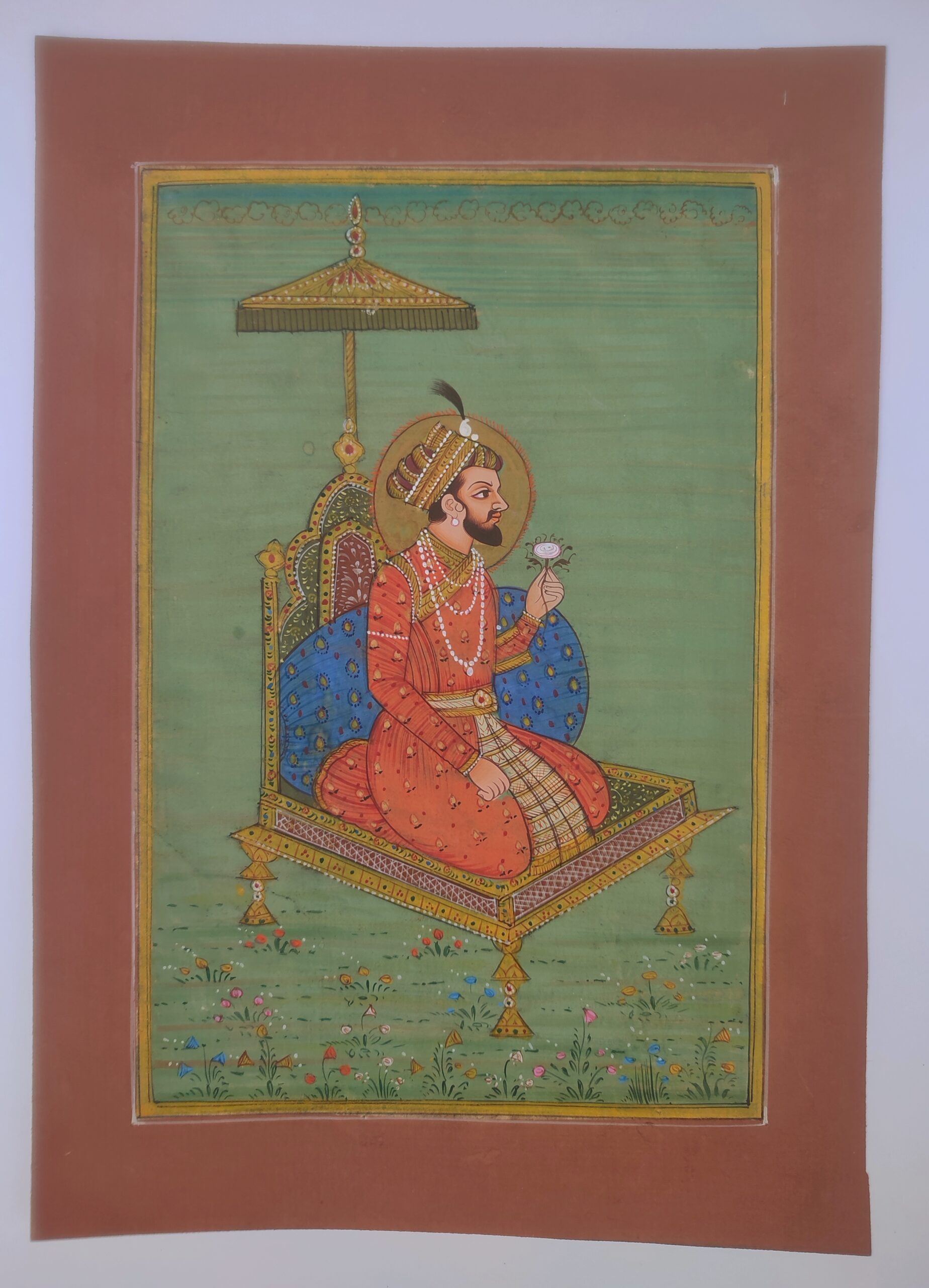 Lamina india pintada Maharaja de Rajastan sentado en trono con flor.