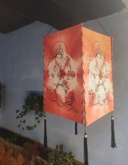 Esta lampara de tela pintada presenta colores intensos, siguiendo los patrones habituales en estas lamparas, lo que les confiere un aspecto llamativo y alegre. Los tonos como el rojo, el amarillo, el azul y el verde son comunes. Son clasicos los disenos vibrantes con patrones geometricos.