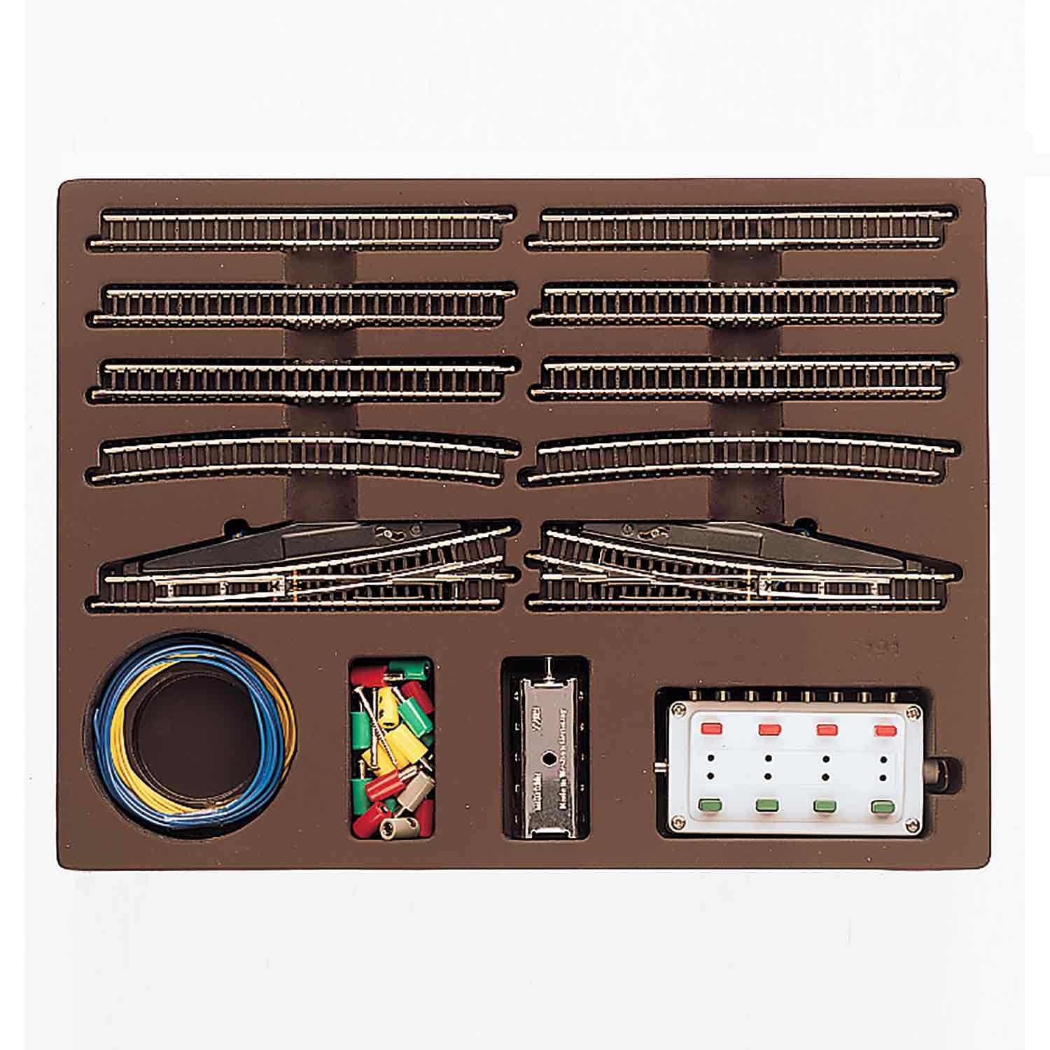 Contiene 10 vías rectas, 2 vías curvas, 2 desvíos, pupitre de posicionamiento de agujas, placa distribuidora, material de conexión e instrucciones de montaje.