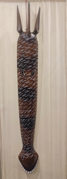 Mascara africana de madera modelo cebra. Esta tallada con una gran profusion de detalles y decorada con pintura blanca.