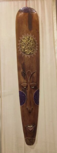 Mascara africana de madera. Esta tallada con una gran profusion de detalles y decorada con tonos morados y dorados.