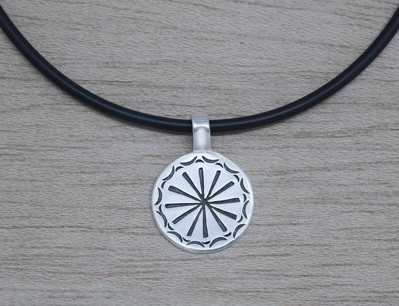 Producto vasco colgante EKHI grande de plata con cordon de caucho mitología vasca artesanía TXUS GRUZETA.
