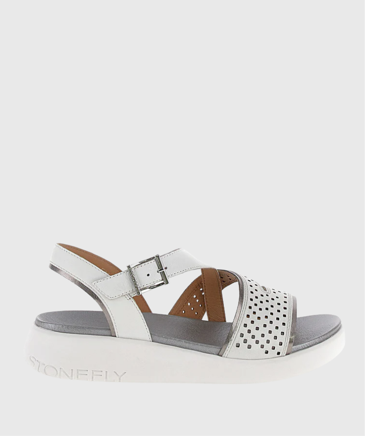 220962 SANDALIAS STONEFLYONDA 3 NAPPA LTH Sandalia sin tacón da mujer in napa blanco con ajuste regular. Cómoda, moderna y versátil, presenta una parte superior perforada y adornada con bordes metálicos. Este modelo ligero y moderno es perfecto para combinar con todos tus trajes veraniegos. Este modelo incorpora la tecnología Second Skin® que hace que el calzado sea suave y ligero, como una segunda piel. Suela EVA, altura del tacón (cm): 4.
