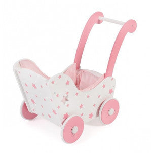 Bonito cochecito de madera para muñecas decorado con estrellas blancas, ¡una exitosa combinación de elementos de diseño tradicionales y modernos! Gracias a las ruedas de goma, este cochecito de muñecas de madera se puede empujar fácilmente y no hace ruido en superficies duras. Viene con un juego de almohadas. La altura de empuje es de 43 cm. Ruedas Whisper (banda de rodadura de goma) Apto para muñecas de hasta 54 cm Medidas: Largo 54 cm / ancho 29.5 cm / alto 45 cm Edad: +12 meses