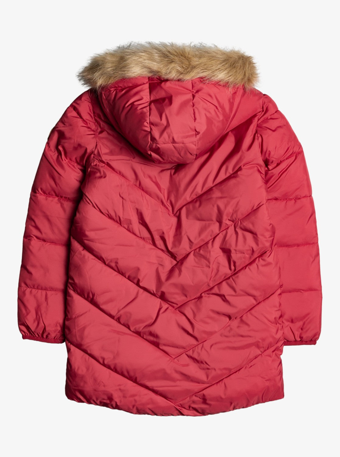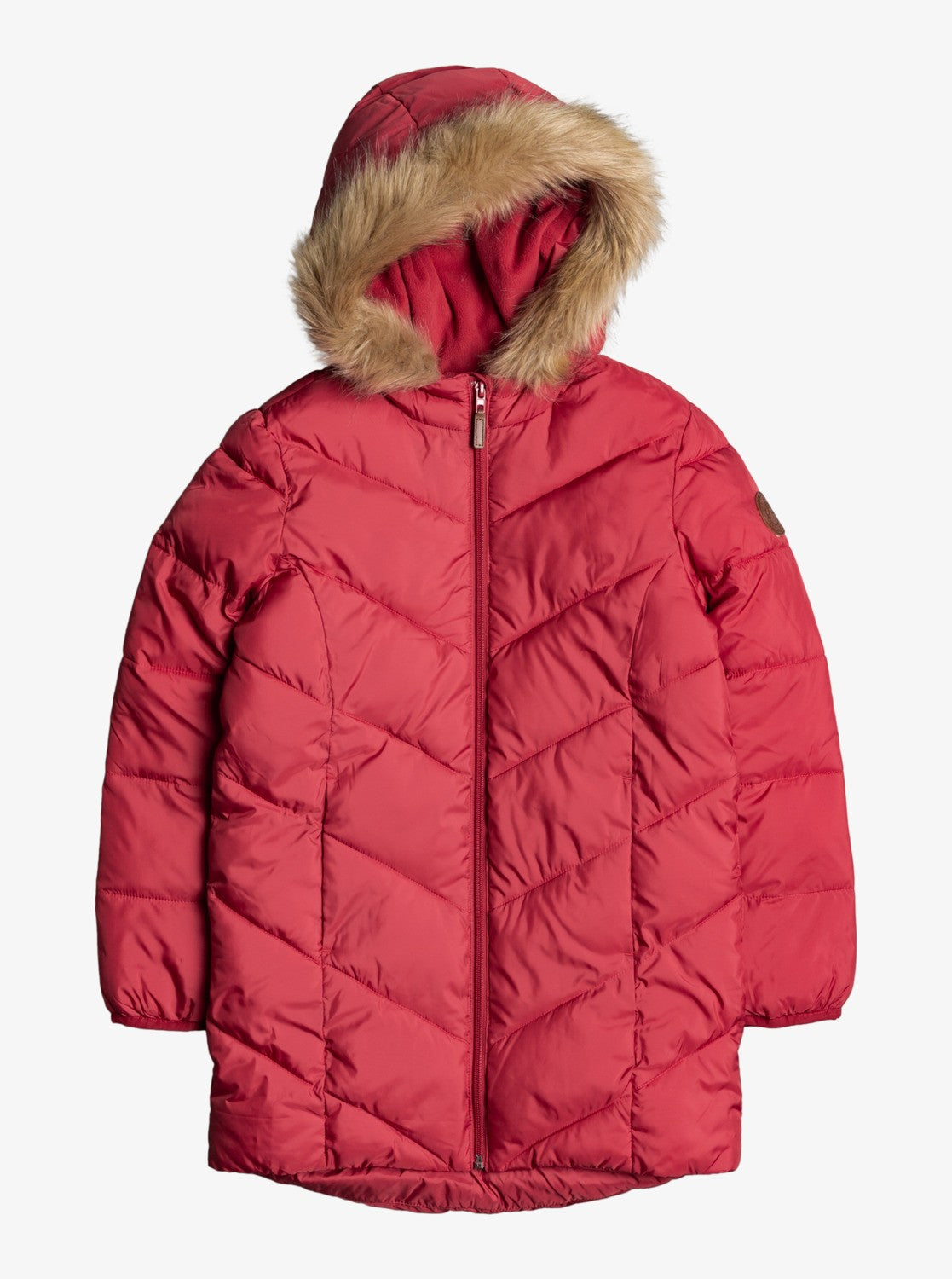 CARACTERÍSTICAS Tejido: Tejido acolchado en quilt en tafetán de poliéster Corte: corte normal más largo para mayor cobertura Tejido Interior: Cuerpo e interior de la capucha en polar tono sobre tono Bolsillos:2 bolsillos en la parte frontal Pelo sintético alrededor de la capucha Acolchado en quilt con diseño espigado en todo el cuerpo Parche ROXY de cuero en la manga izquierda