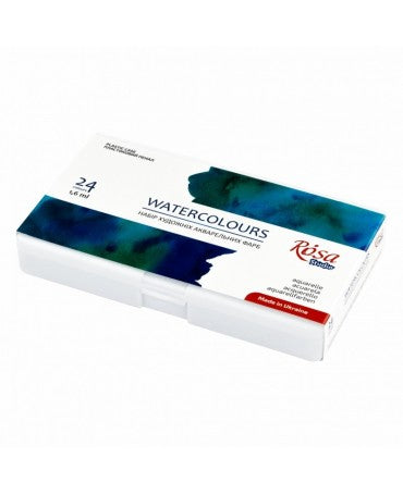 Caja de plástico con: 24 medio godets (1,6ml) Y paleta de mezclas Las acuarelas ROSA Studio están diseñadas para el estudio y la práctica. Pigmentos de alta calidad, cuidadosamente seleccionados, y aglutinante vegetal natural con goma arábiga garantizan la pureza de los colores y una fácil aplicación. La caja de acuarelas ROSA Studio con 24 medio godets/pastillas, se elaboran con colores tradicionales de la técnica de la acuarela. Los colores del set se mezclan fácilmente, creando una amplia paleta de nuevos colores y matices. La mayoría de las pinturas del set son de un solo pigmento, lo que permite aprender y experimentar con la mezcla. Tras el secado, las pinturas forman una capa de color mate que realza la exquisitez y la atmósfera de la obra. • Los colores básicos, al mezclarse, crean una amplia paleta de colores. • Los pigmentos de alta calidad proporcionan una combinación de intensidad y transparencia a las acuarelas. • Cada color tiene una amplia gama, desde saturado en una capa densa hasta ligeramente transparente al diluirse. • Aglutinante vegetal natural con goma arábiga, elástico tras el secado. • La técnica tradicional de secado natural de las acuarelas facilita su dilución con agua y su aplicación con pincel. Las acuarelas de ROSA Studio se desarrollan con la colaboración de profesores de instituciones educativas de arte de Ucrania. La caja incluye 24 colores: 301 - Lemon, 302 - Yellow Light, 303 - Yellow Medium, 304 - Orange, 305 - Red Light, 306 - Red Deep, 307 - Madder, 308 -Carmine, 309 - Violet Light, 310 - Violet Deep, 311 - Green Light, 312 - Green, 313 - Emerald Green, 314 - Turquoise, 315 - Blue, 316 - Ultramarine, 317 - Blue, 318 - Yellow Ohre, 319 - English Red, 320 - Raw Sienna, 321 - Burnt Sienna, 322 - Raw Umber, 323 - Sepia, 324 - Lamp Black