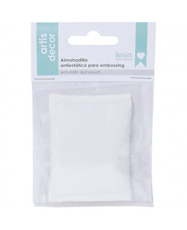 ALMOHADILLA ANTIESTATICA PARA EMBOSSING ARTIS DECOR Esta bolsa de polvo de talco te ayuda a eliminar la electricidad estática de tu papel, evitando que algunas partículas de los polvos de embossing queden adheridas por la electricidad estática donde no hay tinta.Aplica la bolsa antiestática sobre tus cartulinas o papeles donde quieres hacer embossing, retira el exceso de polvos, luego estampa y aplica tus polvos, verás como los polvos de emboss quedan únicamente adheridos donde hay tinta.