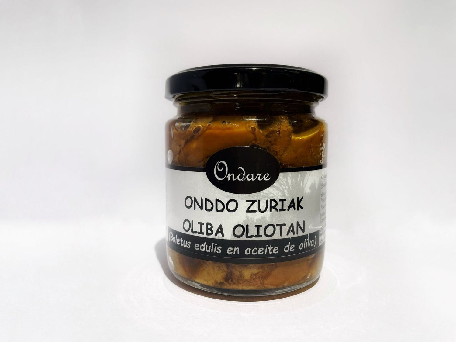 Boletus Edulis en aceite de oliva. ONDARE es una empresa de Mutriku, costa de Gipuzkoa, creada en el año 2013 y en ella se dedican a la elaboración de mermeladas y conservas vegetales de calidad y artesanas. La razón principal de crear ONDARE fue el comercializar conservas sostenibles elaboradas con frutas y verduras de los caseríos del entorno más cercano, impulsando así la economía local y aprovechamiento de productos de temporada.