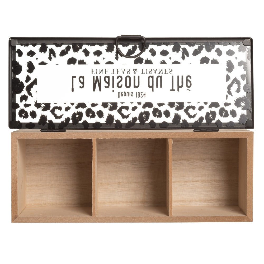Caja para guardar infusiones: teas, tisanas, ... con tres compartimentos y tapa de cristal decorada Material: madera Medidas: 24 x 9 H 9 cm.