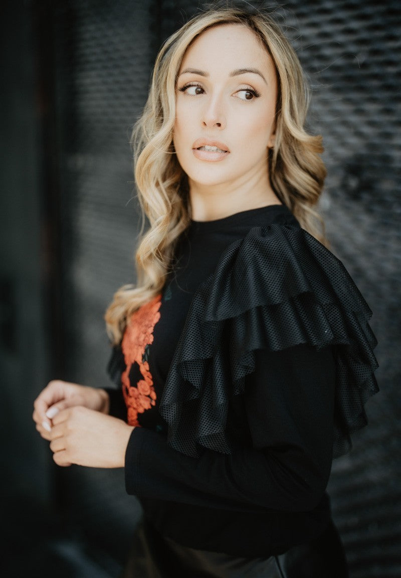 Camiseta de manga larga con el mensaje “Vive y sé feliz, y haz que los demás lo sean”, palabras de Mary Shelley, la madre de Frankenstein.