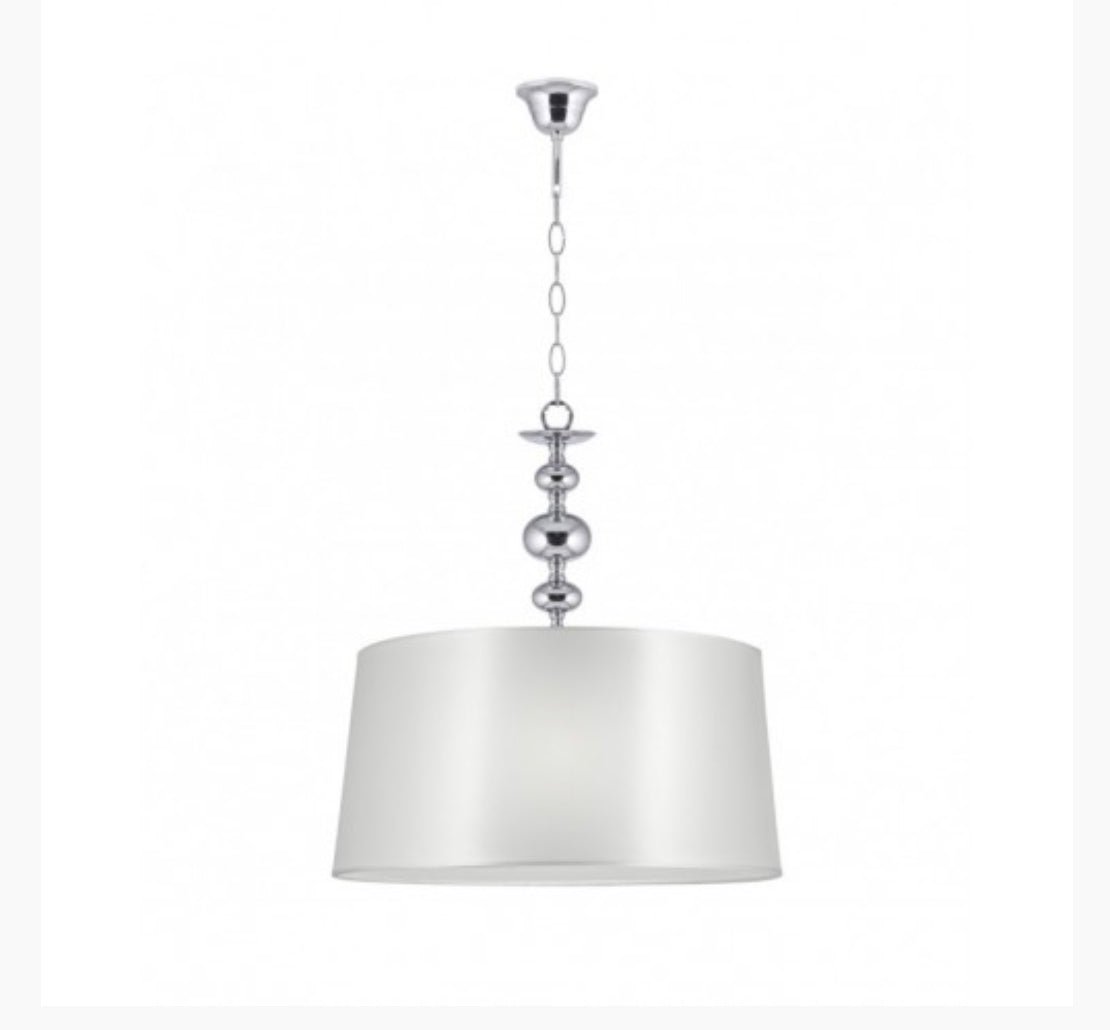 1XE27 (Bombilla Excl.) MAX60W Material: Cromo, Textil Color: Cromo, Gris Perla Tamaño: 40x40x46cm (Diámetro) Alto Min. 46cm IP20 Uso Interior