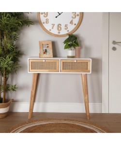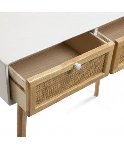 CONSOLA NÓRDICA Madera paulownia Largo: 80.5 cm. Ancho: 30 cm. Alto: 78 cm. Material: Madera paulownia Madera pino Agregar a la lista de deseos Estructura y patas : Madera PaulowniaCajones : ratan y contrachapadoPatas : desmontables