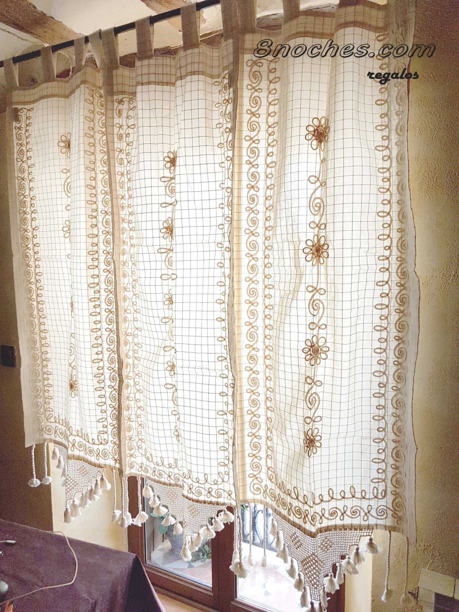 La cortina Turquia de algodon tiene una preciosa cenefa y un dibujo central realizado con una delicada cinta. Termina en un pico de ganchillo con borlas a juego. La tela esta cosida formando cuadraditos que le dan prestancia. Material: 100% algodon Medidas: 145 x 60 cm Debido a sus anchas trabillas, la colocacion de la cortina sobre una barra es muy sencilla. Puedes colocarla en una ventana estrecha, para separar un espacio o colocar varias seguidas como en las imagenes. Puedes ver mas cortinas pinchando aqui. Siguenos en Facebook y en Instagram