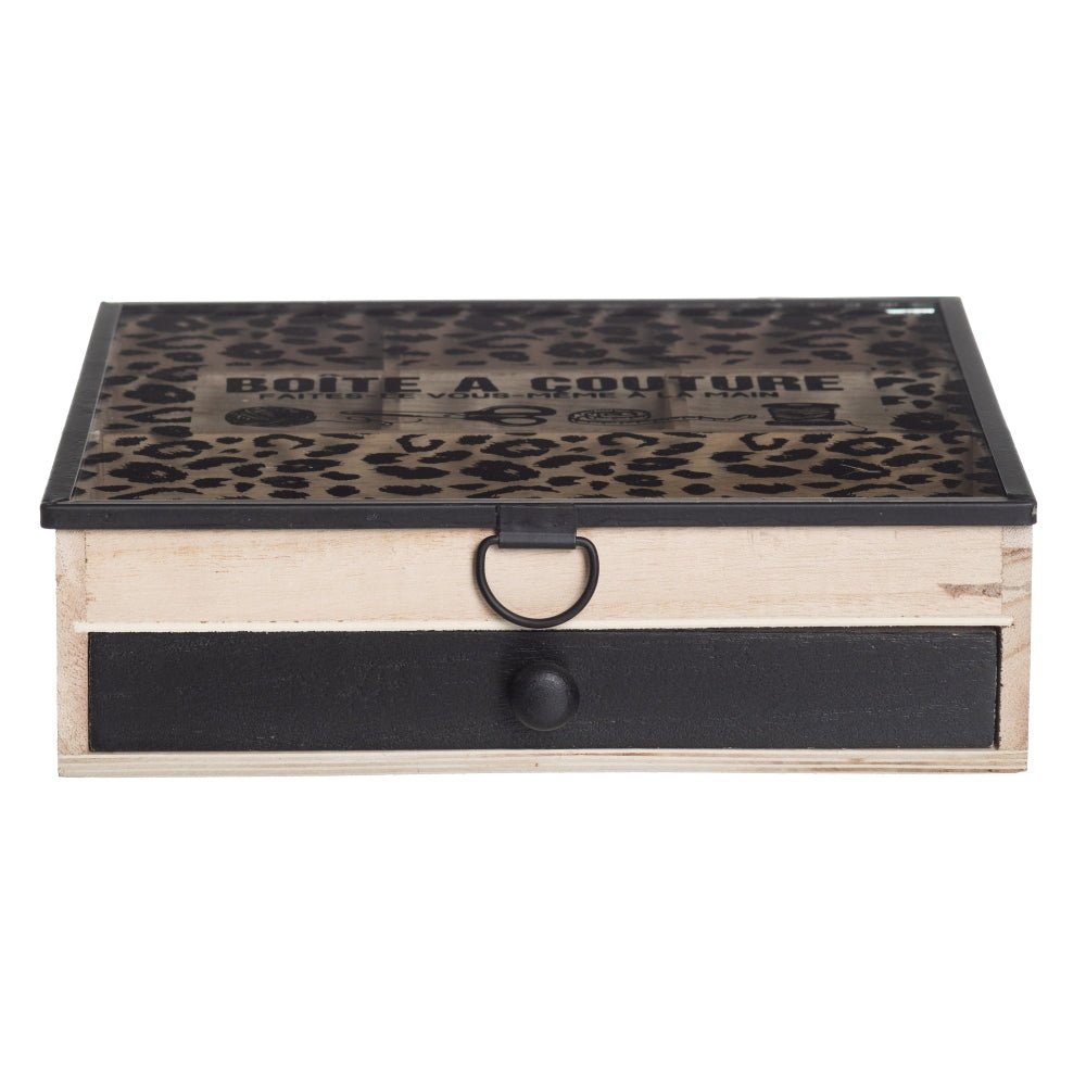 Costurero de madera natural con tapa de cristal y un cajón Medidas: 24 x 24 H 7 cm.