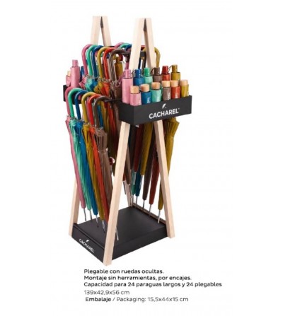 Expositor de paraguas Cacharel con una capacidad para 24 paraguas largos y 24 plegables. Plegable con ruedas ocultas. Montaje fácil sin herramientas, por encajes. Material: madera y metal. Para tiendas consultar precio.