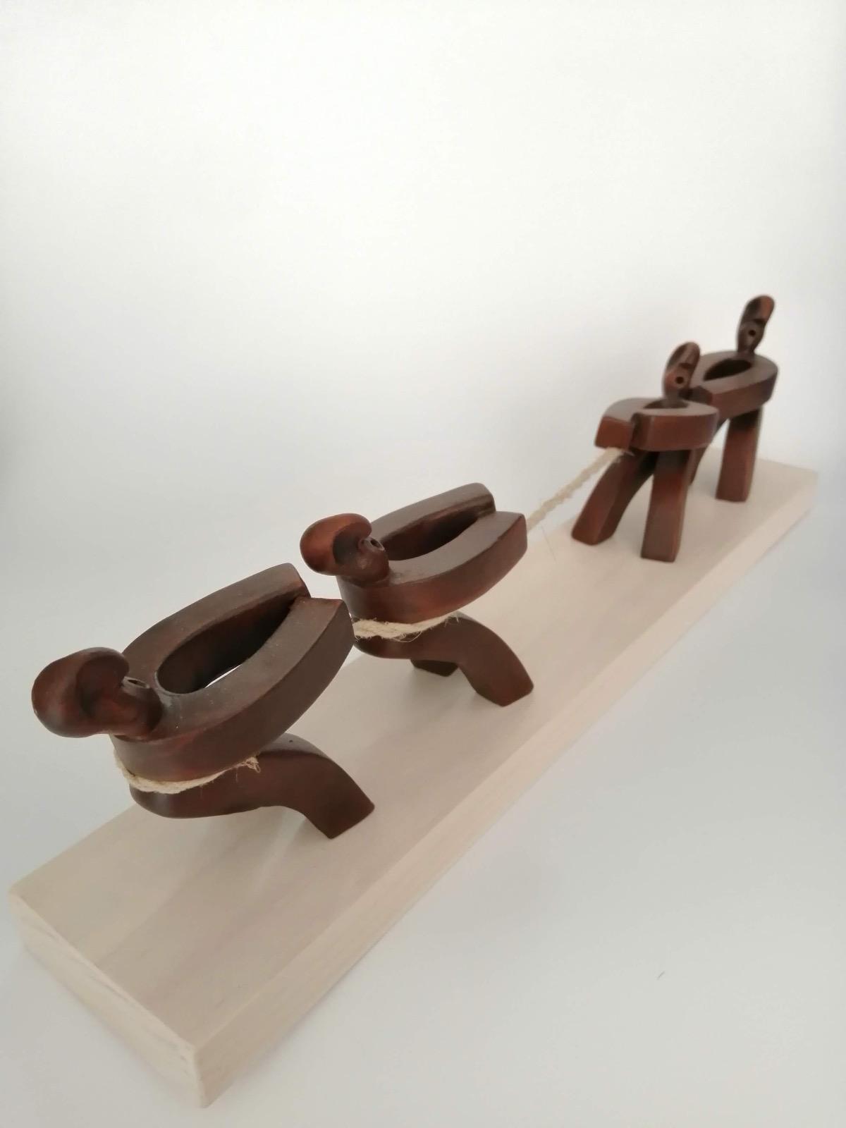 pieza elaborada en cerámica con una base de madera de 45x8 altura con la figura 13 cm