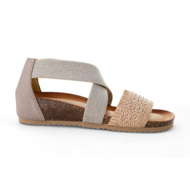 Sandalia italiana de piel y rafia, con planta anatómica que facilita el confort. Cuña de 3,5 cm ligera y antideslizante.
