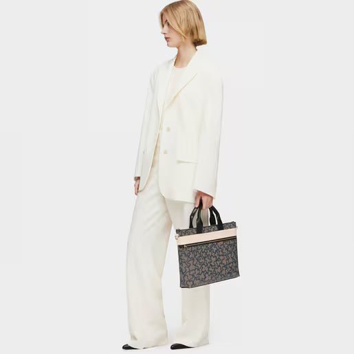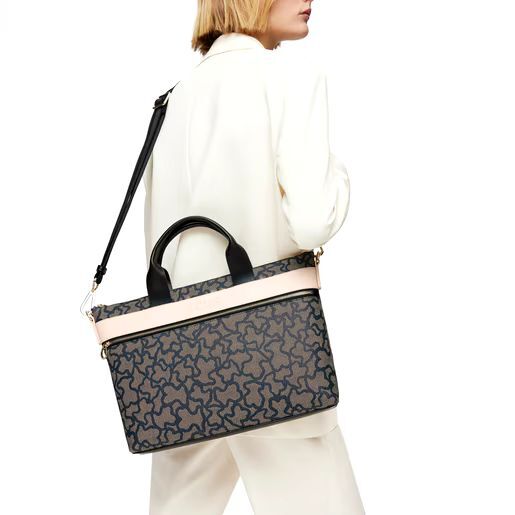 Bolso maletín de Tous de la colección Kaos Icon de lona estampada con ositos en color negro con detalles de piel sintética como el agarradero en beige y las asas en negro.