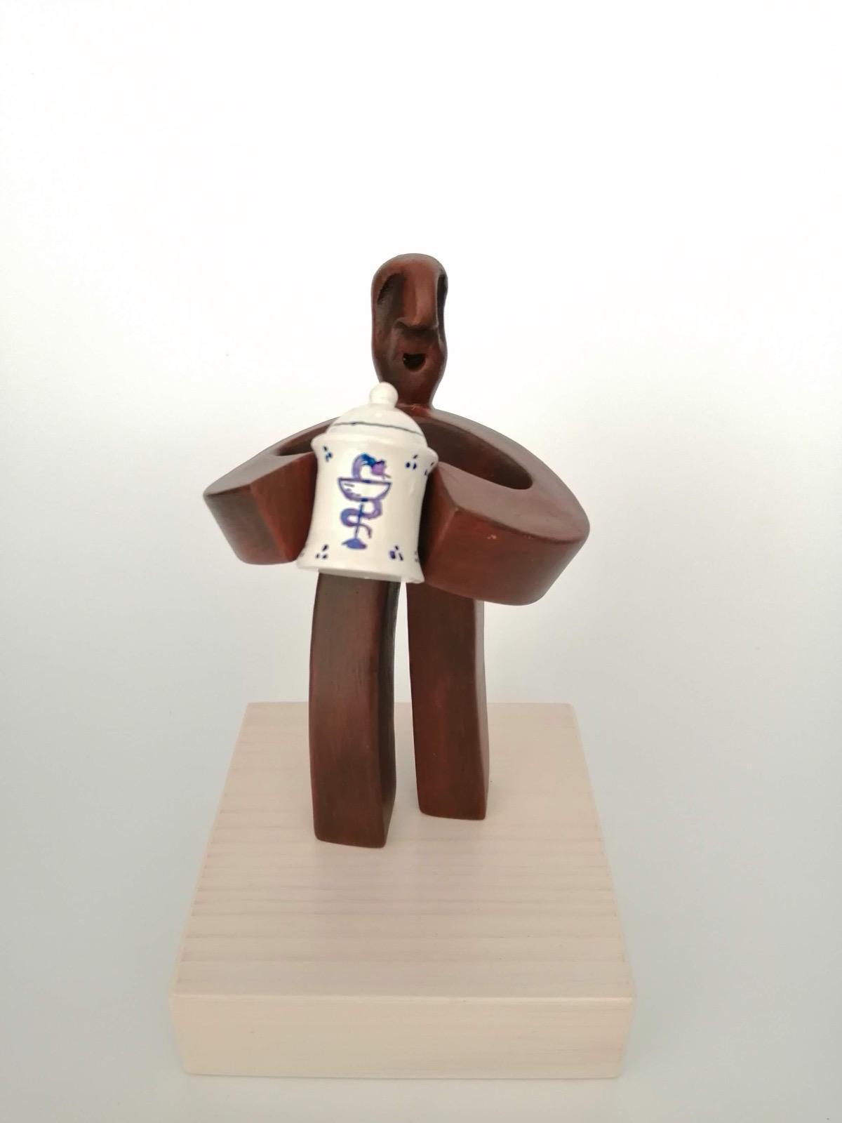 Pieza elaborada en cerámica con una base de madera de 10x10 altura con la figura 18cm